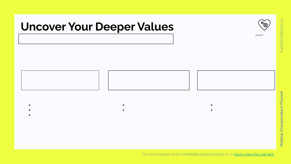 Get your Guide: Uncover Your Deeper Values This simple but profound 3-step guide helps you come back to yourself by going deeper than surface level values. Email Address I'm ready By signing up, you agree to subscribing to the Monday Musings newsletter as well. Amazing! Uncover Your Deeper Values should be in your inbox shortly. Check all folders. Email me at michelle@supergoodsociety.co if you didn’t get it.